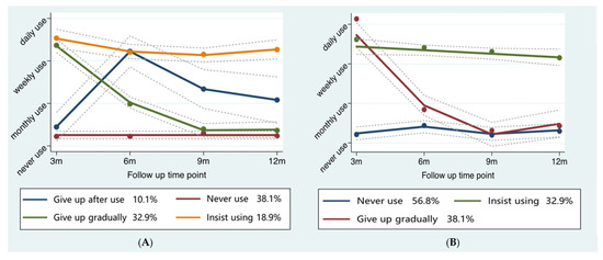 The BIC results, percentage of the smallest group, and fit parameter estimates of GBTM were presented in the Tables S1–S4. Considering the BIC results and explainability, the usage of food guiding booklet was identified as four patterns among participants in the intervention group (Figure 3A): Insist using (103, 18.9%), Give up gradually (179, 32.9%), Give up after use (55, 10.1%), and Never use (207, 38.1%). Similarly, the usage of the dinner set was presented as three patterns (Figure 3B): Insist using (141, 26.0%), Give up gradually (141, 26.0%), and Never use (309, 56.8%). Insist using referred to the individuals insisting on using dietary management tools from baseline to 12 months. Give up gradually included those who weekly used the food management tools at 3 months follow-up but gradually gave up later. Give up after use referred to those who initially barely used the food guiding booklet but weekly used them at 6 months follow-up and gradually gave up later. And never use represented participants who did not use food management tools throughout the follow-up.