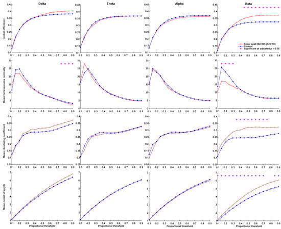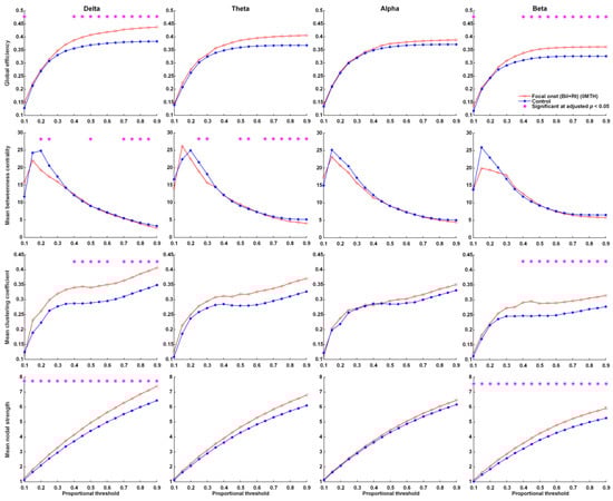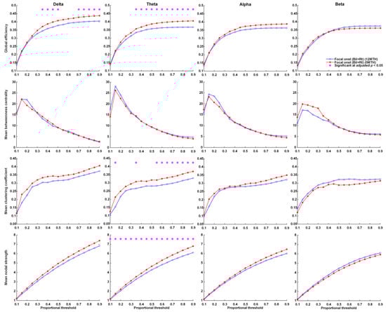 During the study period, FOS patients with left or bilateral EEG lateralization did not present significant changes across proportional thresholds in global efficiency, mean clustering coefficient, mean nodal strength, or mean betweenness centrality in the delta, theta, alpha, or beta frequency bands (Supplementary Figures S2 and S3).