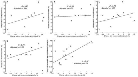 Based on the CBCL/6-18 submitted by fathers, changes in the mean clustering coefficient in the delta band were significantly positively correlated with the change rates of social problems (R = 0.76, adjusted p = 0.04) and conduct problems (R = 0.80, adjusted p < 0.05) (Figure 4A,B), whereas changes in mean nodal strength in the delta band were significantly positively correlated with the change rates of social problems (R = 0.72, adjusted p = 0.03) and conduct problem (R = 0.73, adjusted p < 0.05) (Figure 4C,D). Changes in global efficiency were slightly positively correlated with the change rates of social problems (R = 0.75, adjusted p = 0.06) in the delta band and with the change rate of thought problems (R = 0.66, adjusted p = 0.08) in the beta band. Based on the CBCL/6-18 submitted by mothers, changes in the mean attention deficit/hyperactivity disorder were slightly positively correlated with changes in the mean clustering coefficient (R = 0.64, adjusted p = 0.06) and significantly positively correlated with changes in mean nodal strength (R = 0.67, adjusted p = 0.03) in the delta band (Figure 4E).