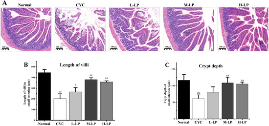 The histopathological observation of the small intestine was shown in Figure 2A. In the normal group, the villi of the small intestine were orderly arranged, with deep crypts and thick and clear brush borders. While in the CYC group, the lengths of the villi in the small intestine were significantly decreased, the crypts were shallow or absent, the intestinal wall was thinned, there was slight edema, and some cells had inflammatory infiltration. After the administration of different doses of LP, the intestinal-related structures and morphology of mice in the CYC group were improved to different degrees. The improvement of intestinal tissue structure in the M-LP group was more obvious than that in other LP treatment groups. The improvement of intestinal tissue structure in the M-LP group was more obvious than that in other LP treatment groups. In addition, as shown in Figure 2B,C, the villus length and crypt depth of the small intestine in the CYC group were significantly decreased compared with the normal group (p < 0.01). Compared with the CYC group, the length of the intestinal villus in LP groups was increased, especially in the M-LP group (p < 0.01). In addition, the crypt depths of the small intestine were also increased in LP groups, especially in M-LP group (p < 0.01).