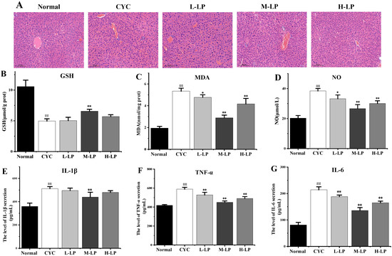 Effects of LP on CYC-induced liver injury in mice. (A) Effects of LP on morphology and structure of liver tissue in mice (20×). (B–G) Effects of LP on GSH (B), MDA (C), NO (D), IL-1β (E), TNF-α (F), and IL-6 (G) in mouse liver tissues. Note: n = 3, ## p < 0.01 vs. Normal group, * p < 0.05, ** p < 0.01 vs. CYC group.