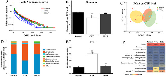 Effect of LP on CYC-induced intestinal microbiota imbalance in mice. (A) Rank-abundance curves; (B) Shannon index; (C) PCoA analysis; (D) Analysis of intestinal microbiota structure at phylum level; (E) F/B ratio; (F) Analysis of differential intestinal microbiota at genus level. Note: n = 6, ## p < 0.01 vs. Normal group, ** p < 0.01 vs. CYC group.