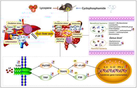 Preventive mechanism of lycopene on intestinal toxicity caused by cyclophosphamide chemotherapy in mice by regulating TLR4-MyD88/TRIF-TRAF6 signaling pathway and gut-liver axis. The blue arrows show the effect of CYC treatment, and the red arrows show the effect of LP treatment on CYC mice. ↑: up-regulation; ↓: down-regulation.