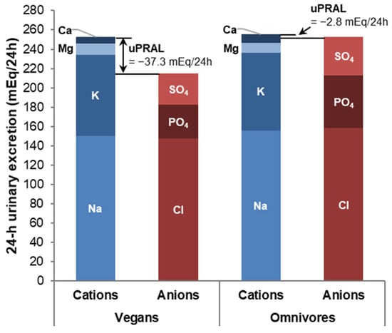 As is noticeable in the urine ionogram (Figure 1), the lower uPRAL of vegans was mainly driven by lower phosphate and sulfate excretions (p = 0.0004 and p = 0.01, respectively), which corresponded with lower protein intake among vegans vs. omnivores (p = 0.02; Table 1; correlation with protein intake: rSpearman = 0.41, p = 0.0005 for phosphate and rSpearman = 0.63, p < 0.0001 for sulfate).