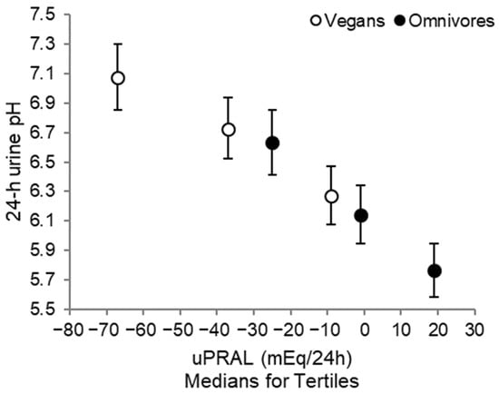 Of note, as shown in Table 2, five vegans fall into the third uPRAL tertile, equivalent to moderate acid load (median uPRAL = 14.1 mEq/24 h), and three omnivores fall into the first uPRAL tertile, equivalent to pronounced alkali load (median uPRAL = −53.6 mEq/24 h).