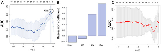 Study participants in the OBG group did not display any significant difference in their calendar Age, iAge® and serum Eotaxin-1 levels, compared to PCB control at baseline (Supplementary Materials Figure S2). Compared to baseline, the iAge® at 2 weeks post intervention showed a trend toward a decrease in iAge® in the oat treatment (OBG) group, although this was not statistically significant. In comparison, the iAge® in the rice control group (PCB) did not show any significant variation (Supplementary Materials Figure S3). To examine whether baseline attributes can predict changes in iAge and its proteins at week 2 and week 4 following daily consumption of OBC or PCB, we applied Least Absolute Shrinkage and Selection Operator (LASSO) regression, a standard machine learning approach largely utilized for predictive tasks and feature selection. LASSO imposes a penalty to the regression coefficients such that small coefficients are shrunken to zero, and only the most relevant features are selected. The changes in iAge® for each subject in the study were calculated. A total of 39 baseline features, including the subject’s demographics, blood biomarkers for cardiovascular health and lipid fractions, liver function, metabolism, and inflammation, were used as input (predictor) variables (see Methods). Using this method, four variables were selected for the prediction of the changes in iAge® in week 2 versus baseline in the OBC group, and these provided a relatively robust prediction accuracy (cross-validated area under the curve (AUC), cvAUC = 0.72) (Figure 1A). Of the four baseline predictors selected by our model (Figure 1B), two were negative predictors, and these include total fiber content (g/day) and systolic blood pressure, and two were positive, including the percentage of dietary saturated fatty acid intake (%SFA) and baseline iAge®. Of these four features, baseline iAge® was the strongest predictor of response to the oat product intervention (Figure 1B). The model for predicting changes in iAge® using baseline parameters in the PCB group yielded a cvAUC = 0.48 (no different from a random distribution), suggesting that no relevant features contribute to the stratification of responders vs. non-responders in this group (Figure 1C).