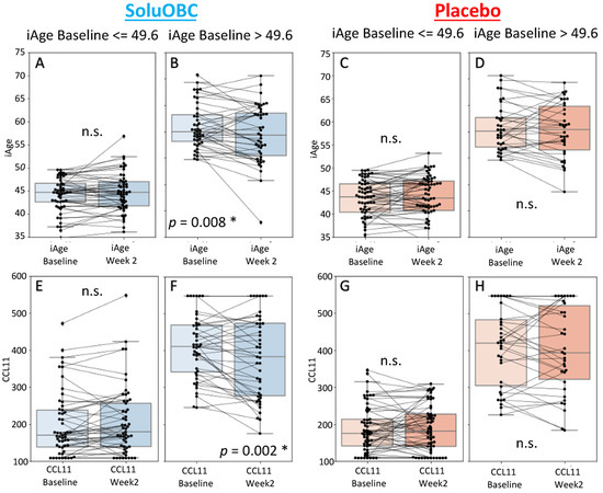 Effects of stratification by baseline iAge® on changes in iAge® and CCL11 after 2 weeks of Oats treatment. The value for iAge® or CCL11 (y-axes) is provided for each patient as a black dot, and the change in that value for each patient between baseline as week 2 (x-axes) is represented by a connecting black line. The statistics for each group are shown using box plots, and significance between baseline and week 2 was calculated using a pairwise two-tailed t-test. The optimal cut-point for baseline iAge® was calculated to be 49.6 years using cutpointR. Stratification of individuals treated with oats by baseline iAge® showed no significant (n.s.) change in iAge® at week 2 for those with a low baseline iAge® (A), with a significant (asterisk) decrease for those with a high baseline iAge® (B). No change was observed in iAge® at week 2 with the placebo group (C,D). Stratification of individuals treated with oats by baseline iAge® showed no significant change in CCL11 at week 2 for those with a low baseline iAge® (E) and a significant decrease for those with a high baseline iAge® (F). No change was observed in iAge® at week 2 with the placebo group (G,H). CCL11, Eotaxin; SoluOBC, oat product providing 3 g of β-Glucan.