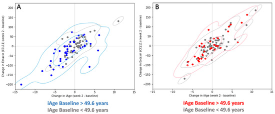 Effects of CCL11 changes on iAge®. The change in iAge® between baseline and week 2 (x-axis) is compared to the change in CCL11 between baseline and week 2 (y-axis) for each patient. Individuals were stratified based on a high baseline iAge® (blue circles) or low baseline iAge® (grey circles). (A) Those in the oat group and have a high baseline iAge® trend towards a lower iAge® at week 2 and lower CCL11 level. (B) Those in the placebo group have no decreasing or increasing iAge® or CCL11 level trends.