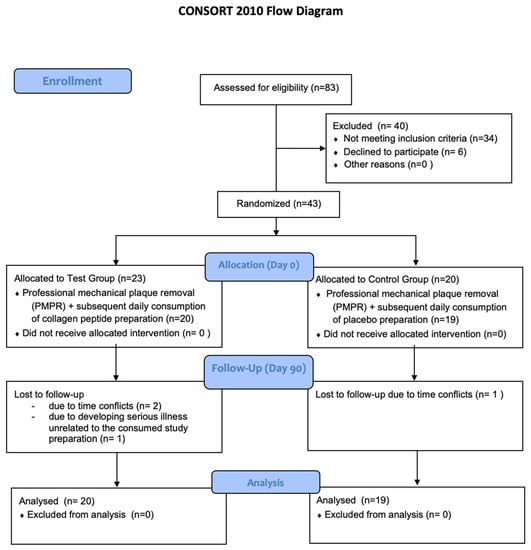The test preparation (Verisol®B, GELITA AG, Eberbach, Germany) consisted of a mixture of specific, bioactive collagen peptides with an average molecular weight of approximately 2 kDa and an average particle size of about 150 μm. The placebo preparation consisted of silica (Evonik, Germany) being identical regarding taste, smell and color, as well as particle size and consistence to the test preparation. Both experimental preparations were manufactured in compliance with the European Community (EC) regulation 852/2004 on the hygiene of foodstuffs and packaged in individual code-labelled sachets containing the daily dosage of 5 g. According to the manufacturer’s information, the daily dose of the collagen hydrolysate administered for improving skin conditions is usually 2.5 g [,]. Evidence from other medical fields concerning the therapy of knee joint pain [] or osteoporosis [] as well as unpublished pretrial data on the impact of collagen peptides on gingivitis suggested that doubling the dosage to 5 g daily may be advisable.