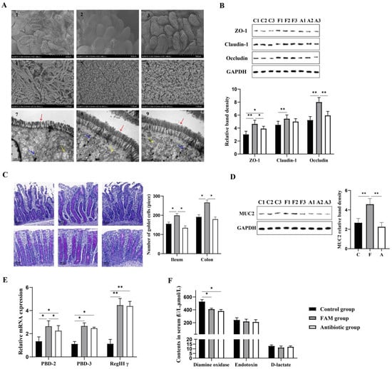 As shown in Table 1, FAM and antibiotics significantly increased body weight and decreased diarrhea incidence of weaned piglets. In addition, increased number of microvilli and mitochondria, and restored epithelial junctions were observed in FAM and antibiotic group, indicating FAM or antibiotics improved intestinal morphology (Figure 1A). Furthermore, intestinal barrier function in weaned piglets was measured. As shown in Figure 1B,D, compared to control and antibiotic-treated piglets, FAM-treated piglets had higher expression levels of tight junction proteins (ZO-1, and Occludin) and MUC2 protein as well as higher number of goblet cells. Relative mRNA expression of antimicrobial peptides (AMPs) was analyzed by qPCR, involving porcine beta defensin-2 (PBD-2), porcine beta defensin-3 (PBD-3) and regenerating islet-derived IIIγ (RegIIIγ) (Figure 1E). The results showed that FAM or antibiotics significantly upregulated the expression of PBD-2, PBD-3 and RegIIIγ, and PBD-2 expression in FAM group was much higher than that of in antibiotics. To further clarify intestinal epithelial functions were improved following FAM supplementation, the levels of serum endotoxin, DAO and D-lactate were detected. As shown in Figure 1F, the level of DAO was significantly decreased following FAM treatment (Figure 1G), demonstrating FAM improved intestinal barrier function and intestinal permeability.