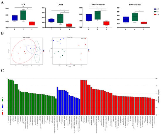 The diversity and structural changes of intestinal microbiota in piglets. (A) Alpha diversity of the microbial community estimated by observed species, Chao1, ACE, and PD whole tree in the colon. (B) Scatter plot of PCoA based on weighted Unifrac distance. NMDS plot of bacterial communities based on BrayCurtis distance separated the three groups. (C) LDA score plot of colonic microbiota with significant differences among groups were obtained from LDA Effect Size (LEfSe) analysis. Microbiota with LDA score higher than 2 were considered as biomarker microbiota (p: phylum level, c: class level, o: order level, f: family level, g: genus level). C: control group, F: FAM group, A: antibiotic group. ** p < 0.01, * p < 0.05.