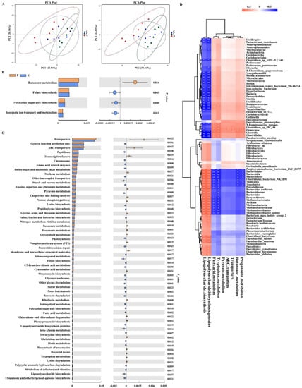 Studies have demonstrated that probiotics can regulate the structure and diversity of gut microbiota in the host []. Our present study showed that observed species, Chao1, ACE and PD whole tree of gut microbiota in FAM-treated piglets were significantly increased, suggesting FAM could improve the α-diversity of gut microbiota. Regarding structural alterations of the microbial community, a study showed that probiotics could increase the Firmicutes: Bacteroidetes ratio and reduce diarrhea in a piglet model []. In the present experiment, the Firmicutes was increased while the Bacteroidetes was decreased following FAM treatment, consistent with the previous study. In addition, LEfSe analysis further revealed FAM markedly increased the relative abundance of 18 bacterial biomarkers including Clostridiales, Ruminococcaceae, Firmicutes and Muribaculaceae and decreased relative abundance of 22 microbial biomarkers involving swine Streptococcus, Bacteroides, and Megamonas. Ruminococcaceae is the main bacteria that convert primary bile acids into secondary bile acids and further facilitated intestinal absorption and innate defense [,]. The Genomic analysis revealed that Muribaculaceae (S24-7) had functional diversity in degrading complex carbohydrates []. The results suggested that FAM modulated microbial diversity and promoted the relative abundance of beneficial microbiota.