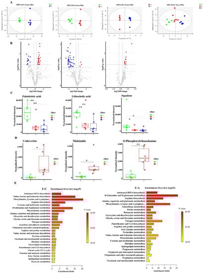 Selected metabolites that significantly changed and the enrichment analysis among groups. (A) OPLS-DA score plots of metabolomics were obtained by GC/MS, from left to right: the comparison of F and C, A and C, F and A, also, F and A and C. All individuals were separated as clusters that conforming the experimental deign. (B) Volcano plots showed the relationship between log2 (Fold Change) and -log10 (p.value). (C) Several metabolites with beneficial effects markedly increased in F group. (D) Relative concentration of amines between F and A groups that showed differences. (E) The top 25 KEGG metabolic pathways with differences between F and C groups, F and A groups. The bottom scale showed the enrichment ratio of each pathway and the color depth of each bar indicated the degree of the difference. C: control group, F: FAM group, A: antibiotic group. ** p < 0.01, * p < 0.05, blank represents no significant differences.