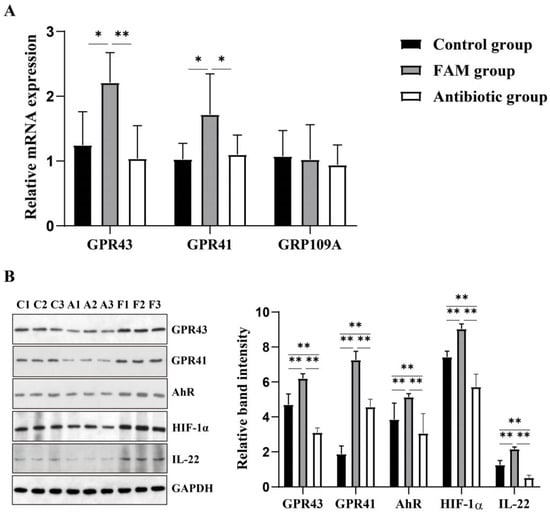 The variation of factors on SCFAs-IL-22 pathway in the colonic mucosa. (A) Relative mRNA expression of GPR43, GPR41 and GPR109A in colonic mucosa. (B) Relative protein levels of GPR43, GPR41, AhR, HIF-1α and IL-22 in colonic mucosa. ** p < 0.01, * p < 0.05.
