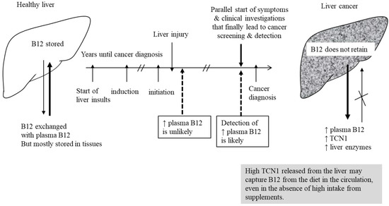 The liver stores large amounts of B12. When liver cells are damaged, vitamin B12 is released into the plasma. Lin et al. found that higher plasma B12 concentrations were associated with liver cancer, while B12 intake did not differ between cases and controls [7]. These results, combined with the lack of association between pre-diagnostic B12 intake and cancer [12], strongly suggest that high plasma B12 is not explained by high vitamin B12 intake. Lin et al. also reported associations between high plasma vitamin B12 concentrations and tumor size, the degree of liver injury, and tumor progression [7], suggesting that with progression of the tumor and liver damage, vitamin B12 (of so far unknown origin) is increasingly trapped in the circulation.