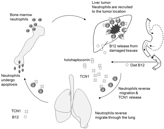 Possible pathomechanisms explaining elevated plasma vitamin B12 in patients with some cancers. Haptocorrin (TCN1) is overexpressed in cancer tissues and this expression is related to the stage of tumor, apoptosis, and inflammation processes. The short-living neutrophils originate from the bone marrow. The neutrophils express high level of TCN1 and are engaged in the body defense against cancer tumor. Neutrophils-originated-TCN1 may capture B12 and explain its retention in plasma.