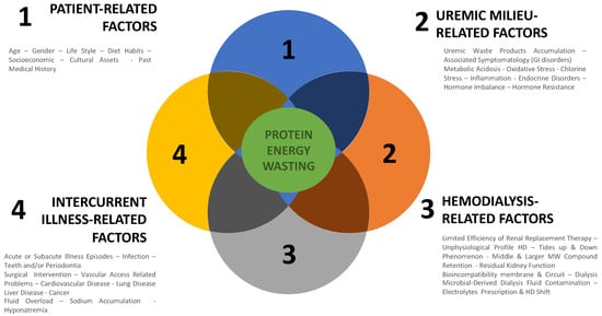 Protein–energy malnutrition has multiple causes in dialysis patients that may act individually but most likely tend to act in combination either simultaneously or sequentially [26,27]. For practical reasons, causes of PEM are analyzed individually and in a more integrated vision. Schematically, they belong to four groups of factors: patient-related factors, uremic-related factors, dialysis-related factors, and intercurrent-illness-related-factors. They are summarized in Figure 1.