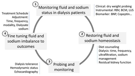 Optimal fluid and sodium management constitute a cornerstone component of dialysis adequacy in reducing cardiovascular burden in this fragile population. This is summarized in the dry weight probing approach [89,90]. Unfortunately, this basic component tends to be overlooked in favor of more attractive uremic toxins for improving cardiovascular burden. Dry weight policy in dialysis patients is a clinical priority that relies on the continuous and fine monitoring of patient conditions as well as anticipation when intercurrent event occurs (i.e., intervention, illness, infection) to preemptively readjust dry weight [91]. Fluid and sodium management represents a key component in dialysis patients working both ways—on one side to prevent fluid overload when secondary catabolism occurs and on the other side to prevent protein–energy wasting associated with chronic fluid overload [51]. Several recent reviews have been dedicated to this topic, to which we refer interested readers for more detailed information [54,92,93]. In this paragraph, we summarized the main points to address this problem in two sections: Firstly, how to monitor adequately fluid status of dialysis patients; secondly, how to restore fluid and sodium homeostasis. This is briefly schematized in Figure 4.