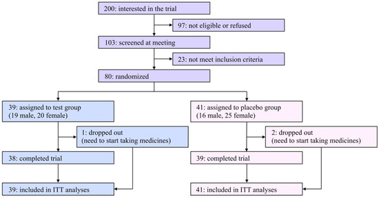 A flow diagram of the participants of this study is shown in Figure 1. Two hundred applicants expressed interest in participating in this study. Among them, 80 eligible participants ages 23–70 were registered in this study after an explanatory meeting and screening and were randomly assigned to the test or the placebo group. Due to limited financial resources and a scheduled deadline, it was hard to recruit a satisfactory number of participants in the COVID-19 pandemic situation; therefore, the original registration goal (n = 100) was unavoidably abandoned.