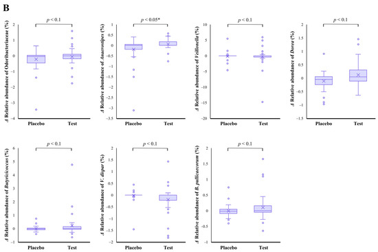 At the genus level, statistical significance was observed only in Anaerostipes, specifically in regard to the difference in relative abundance changes. In this genus, a significant increase (p < 0.05 vs. the baseline) in the relative abundance during the intake period was observed in the test group (Figure 2A), and a significant difference in its changes between the two groups were also observed (Figure 2B, p < 0.05). In the Dorea and Butyricicoccus genera, based on the inter- and intra-group analyses, their abundance relatively increased in the test group through the trial, but no statistical differences were observed. Although among the listed genera, only the Veillonella genus displayed a slightly decreasing change in the test group when compared with that of the placebo group (Figure 2B. p < 0.1); further, there were no notable differences in the intra-group analysis before and after the study period in both groups (Figure 2A). However, a remarkable, but no significant, decrease was observed in Veillonella dispar—which is the only annotatable species in the genus Veillonella in the present study—in the intra- and inter-group analyses (Figure 2A, p < 0.1 vs. the baseline in the test group and Figure 2B, p < 0.1, respectively). On the other hand, although the analysis of the only annotatable species in the genus Butyricicoccus, Butyricicoccus pullicaecorum showed an inter-group difference between the test and placebo groups (Figure 2B, p < 0.1), no statistical difference was also observed in the intra-group analysis vs. the baseline (Figure 2A).