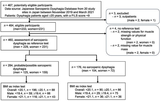We included non-consecutive dysphagic in patients aged ≥20 years with a FILS score ≤ 8 [] between November 2019 and March 2021 in the database. The inclusion criteria was registration in the database [,,,], while the exclusion criteria were (1) outpatients and (2) missing values for BMI and other components of the diagnostic algorithm for sarcopenic dysphagia, such as muscle strength, physical performance, or muscle mass. The reason for choosing these criteria was that BMI was intended to be used to screen for sarcopenic dysphagia at the time of admission.