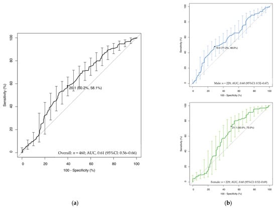 The ROC curve to measure the predictive value of sarcopenic dysphagia. The ROC curve was plotted and the 95% CI of BMI to distinguish between the presence or absence of sarcopenic dysphagia was calculated. Error bar: 95% CI. The CI of the AUC was obtained by 2000 stratified bootstrap replicates. The AUC of the ROC curve was 0.61 (95% CI: 0.56–0.66). (a) The optimal BMI cut-off value was 20.1 kg/m2 (sensitivity, 58.1% (95% CI: 52.1–63.9); specificity, 60.2% (95% CI: 52.6–67.5)) for the overall patients using the closest top-left method; (b) The optimal BMI cut-off values were 19.4 kg/m2 in men (sensitivity, 48.0%; specificity, 71.2%), 21.1 kg/m2 in women (sensitivity, 73.0%; specificity, 50.0%) using the closest top-left method. Abbreviations: AUC, area under the curve; CI, confidence interval; ROC, receiver operating characteristic.