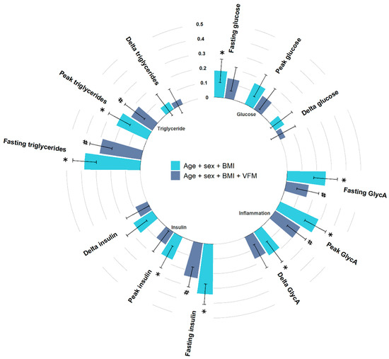 Circos bar plot with bars representing standardised coefficients of linear models between metrics and hypertension status with error bars representing standard error. Bars are colour coded based on covariates. Light blue bars indicate adjustment for age, sex, and BMI, while navy bars indicated adjustment for age, sex, BMI, and VFM. * FDR < 0.05 (for age, sex, and BMI adjusted model), # nominal significant (for age, sex, BMI, and VFM adjusted model). Abbreviations: BMI, body mass index; VFM, visceral fat mass.