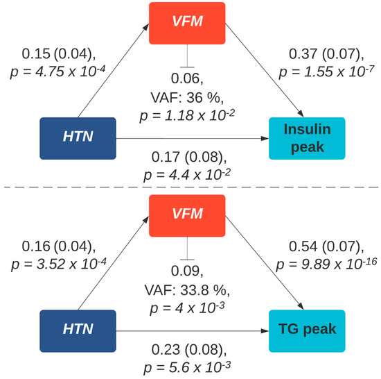 Mediation analysis of the association between hypertension and peak postprandial insulin and triglyceride response via visceral fat. Path coefficients are illustrated beside each path and indirect effect and variance accounted for score is denoted below the mediator. Abbreviations: TG, triglycerides; HTN, hypertension; VAF, variance accounted for.