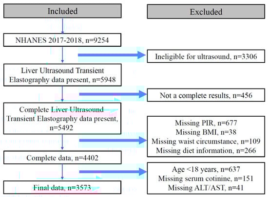 The exclusion criteria of this cross-sectional study were as follows: (1) not complete in the elastography exam (n = 456); (2) missing information of poverty income ratio (PIR) (n = 677), body mass index (BMI) (n = 38), waist circumstance (WC) (n = 109), diet information (n = 266); and (3) those who were aged less than 18 years old (n = 637), missing information of serum cotinine (n = 151), alanine aminotransferase (ALT), and aspartate aminotransferase (AST) (n = 41), displayed in Figure 1. Eventually, 3573 participants with complete demographic information, dietary information, anthropometric measurement results, and biomedical and nutritional examination indexes composed the study population. This survey was approved by the National Center for Health Statistics Research Ethics Review Board (Protocol number: 2018-01) and written informed consent was obtained from all participants.