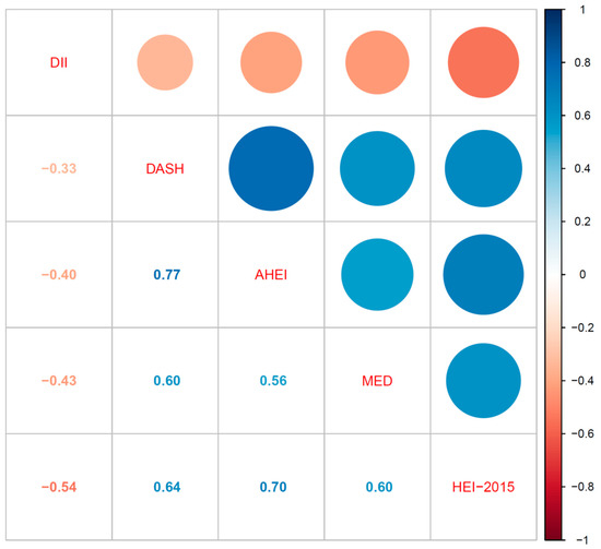 Five dietary quality indexes: DII was designed and developed to compare the inflammatory potential of an individual’s diet based on 45 pro- and anti-inflammatory food parameters []. DII score represented diet inflammatory ability by combining the associations with the six inflammatory biomarkers: IL-1β, IL-4, IL-6, IL-10, TNF-α, and C-reactive protein. The higher the positive DII scores, the stronger the proinflammatory capacity, while the higher the negative DII value, the stronger the anti-inflammatory capacity. For the NHANES dietary questionaries, 28 of 45 food components were used to calculate the DII []. HEI-2015 is the updated version for assessing the fits between dietary intake and the new edition of the 2015–2020 Dietary Guidelines for Americans (DGA) (13 food components, 0–100 points) []. The HEI is based on density (e.g., quantities per 1000 kcal) rather than absolute quantities and relies on a common set of criteria applicable to individuals. The overall score of HEI represents overall diet quality and individual component scores that can be examined together to reveal patterns of quality across multiple dietary dimensions. The AHEI scores originated from 11 food components and points and are given on a scale from 0 to 110 []. All AHEI-2010 components were scored from 0 (worst) to 10 (best). This score, which emphasized high intakes of fruit, vegetables, and whole grains and low intakes of sodium and red and processed meats measures how diets most closely match the high-quality dietary guidelines. The DASH score is derived from eight components (total fat, saturated fat, protein, fiber, cholesterol, calcium, magnesium, and potassium) and is generated by the sum of all the nutrient target intakes (ranging from 8 points to 40 points) []. Mediterranean dietary patterns with a high intake of vegetables, fruits and nuts, and cereals, and a high intake of olive oil, a moderately high intake of fish, a low-to-moderate intake of dairy products and regular but moderate intake of red wines, have been proved to present beneficial health effects. The MED score ranging from 0 (minimal adherence to the traditional Mediterranean diet) to 9 (maximal adherence), is based on the nine indicated components [].