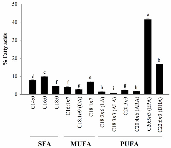The compositions of important FAs of HAGF are shown in Figure 1. The FA compositions in this sample were as follows: SFAs with 22.00 ± 0.48%, MUFAs with 13.63 ± 0.28%, and PUFAs with 64.37 ± 0.75%. Myristic acid (C14:0), palmitic acid (C16:0), and stearic acid (C18:0) were the predominant SFAs, whereas C18:1n7 was the main MUFA instead of 18:1n9. The PUFAs consisted of linoleic acid (18:2n-6; LA), linolenic acid (18:3n-3; ALA), eicosatrienoic acid (ETA; C20:3n-3), arachidonic acid (ARA; C20:4n6), EPA (C20:5n-3), and DHA (C22:6n-3). Among the PUFAs, EPA and DHA showed the highest content, with 41.50 ± 0.62% and 16.65 ± 0.18% of the total FAs, respectively.