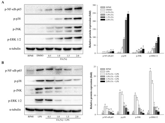 A radio-immunoprecipitation assay buffer (Tech & Innovation, Zhangjiakou, China), with a 0.5 mM EDTA solution and 0.1% protease and phosphatase inhibitor cocktails (Thermo Fisher Scientific, Waltham, MA, USA), was used to separate the protein from treated FA cells. Pierce™ BCA protein analysis (Thermo Fisher Scientific, Waltham, MA, USA) was used to measure the isolated proteins. SDS-polyacrylamide gel was employed to separate the same amount of proteins (30 µg), which were then transferred to polyvinylidene fluoride membranes (Merck, Kenilworth, NJ, USA) in each treatment. The membrane was blocked with 5% skim milk in TBST buffer (1 × Tris-buffer saline (TBS) and 0.1% Tween 20) for 1 h. Based on the previous reports [33], protein levels were estimated using Western blot analysis. Initially, incubation with primary antibodies against phospho-p44/42 MAPK (Erk1/2) (Thr202/Tyr204) (dilution 1:2000; #9101; Cell Signaling Technology, Danvers, MA, USA), phospho-SAPK/JNK (Thr183/Tyr185) (dilution 1:2000; #9251; Cell Signaling Technology, Danvers, MA, USA), phospho-p38 MAPK (Thr180/Tyr182) (dilution 1:2000; #9211; Cell Signaling Technology, Danvers, MA, USA), phospho-NF-κB p65 (Ser536) (dilution 1:2000; #3033; Cell Signaling Technology, Danvers, MA, USA), and α-tubulin (dilution 1:2000; ab15246; Abcam, Cambridge, UK) was performed on the membrane overnight at 4 °C. Following that, a secondary antibody, goat anti-rabbit IgG (H+L)-horseradish peroxidase (HRP) (dilution 1:2000; SA006-500; GenDEPOT, Katy, TX, USA), was then incubated on the membrane for 1 h at room temperature. Pierce® ECL Plus Western Blotting Substrate (Thermo Scientific, Waltham, MA, USA) and ImageLab software (version 4.1, Bio-Rad, Hercules, CA, USA)) were used to identify the protein signal.