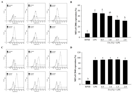 Phagocytosis is caused by various receptors, where ligands bind and interact with cells to receive signals [39]. Generally, macrophages have a phagocytic function and are involved in the early stages of immunity and inflammation [40,41]. HAGF were found to enhance phagocytosis activity, and the effects of these FAs at 1.5% and 2.0% were comparable to those of LPS. The results suggest that HAGF could activate macrophages, which corresponds to the findings in previous reports [32,42]. The expression levels of accessory/costimulatory molecules on the surface of macrophages, such as CD40 and CD86, can influence the inflammatory responses [34]. On the cell surface, CD40 and CD86 have a continuous correlation between antigen-presenting cells (APCs) and T cells [43,44]. In our study, CD86 expression was decreased in RAW264.7 cells treated with LPS. CD40 expression did not change significantly. These findings indicate that the immunological control of RAW264.7 cells is mediated by CD86, rather than CD40.