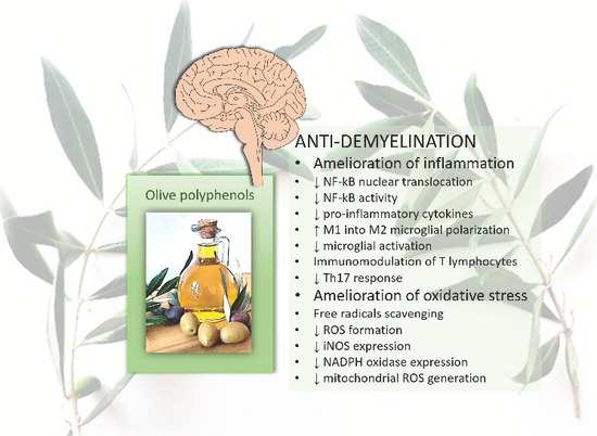 In the context of reducing the risk of multiple sclerosis, olive polyphenols reduce neuroinflammation by decreasing oxidative stress through the reduction of ROS and upregulation of antioxidant enzymes, by the downregulation of pro-inflammatory transcription factors such as NF-kB and AP-1, by regulation of the secretion of pro- and anti-inflammatory cytokines, and by the production of pro-aggressive and regulatory T lymphocytes, and pro-inflammatory and anti-inflammatory microglia.