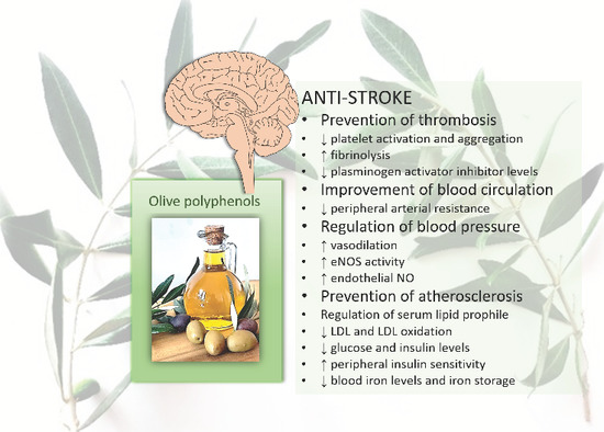 In the context of reducing the risk of cerebral insult, olive polyphenols improve endothelial function by acting directly on the vascular wall or indirectly through the entire system. They decrease oxidative stress and reduce inflammation, reduce and prevent atherosclerotic, atherothrombotic, and arteriosclerotic processes, and improve blood pressure, lipid profile, hyperglycemia, and peripheral insulin sensitivity.