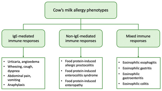 Cow’s milk (CM) proteins are divided into two major classes, caseins (α1-, α2-, β-, and κ-casein) and whey proteins (α-lactalbumin and β-lactoglobulin), which account for 80% and 20% of total protein content, respectively. All proteins can be potential allergens and can induce both immunoglobulin E (IgE) and non-IgE-mediated immune responses, leading to a wide spectrum of clinical manifestations and distinct phenotypes (Figure 1). However, in the case of IgE-mediated CMA, multi-sensitization is more common [11].
