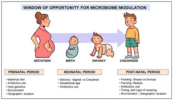 However, recent evidence suggests that the colonization of the gut may begin in utero, contrary to the widespread theory that the fetal environment is sterile [44,45,46]. Hence, the first 1000 days of life, or the time period from conception to two years of age, is considered the critical window for shaping the microbiome and regulating the immune system [47]. Mode of delivery, gestational age, breastfeeding, early exposure to antibiotics, and the timing and type of complementary feeding are the dominant factors (Figure 2) that influence the composition and function of the gut microbiome in this period and, therefore, determine the development of oral tolerance to different antigens [48,49,50,51].