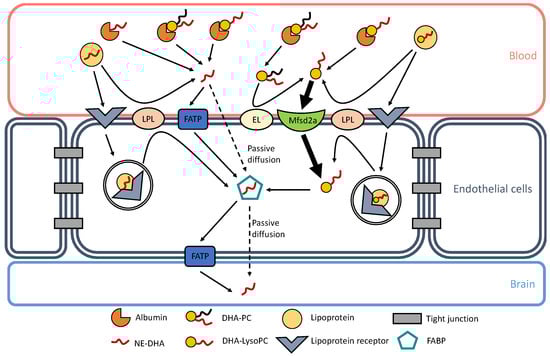 Docosahexaenoic acid (DHA) transport through the blood–brain barrier (BBB). Currently known mechanisms of DHA transport are represented in this figure. In blood, albumin can bind non-esterified DHA (NE-DHA), DHA-containing lysophosphatidylcholine (DHA-LysoPC), and DHA-containing phosphatidylcholine (DHA-PC). NE-DHA is released from albumin in the vicinity of endothelial cell membranes and is incorporated into the endothelium by passive diffusion or transportation through fatty acid transport proteins (FATP). DHA-LysoPC is also released from albumin and can be actively transported into the endothelium through the symport major facilitator superfamily domain-containing protein 2A (Mfsd2a). DHA-PC can also be released from albumin and can generate DHA-LysoP C through the action of an endothelial lipase (EL), as shown by Chen and Subbaiah [51]. Lipoproteins are other carriers of NE-DHA and DHA-LysoPC. They can release NE-DHA and DHA-LysoPC through the action of lipoprotein lipases (LPL). Lipoproteins can also bind to their receptors and go through transcystosis. Inside endothelial cells, lipoproteins can be hydrolyzed and can release either NE-DHA or DHA-LysoPC. In the endothelium, NE-DHA is bound to fatty acid binding proteins (FABP) for it to cross the intercellular space to reach brain cells. NE-DHA can either diffuse passively through the endothelial-brain barrier or be transported through FATP.