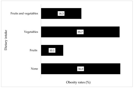Across both surveys, obesity prevalence remained consistently high among those who did not consume fruits and vegetables. Having consumed either fruit or vegetables slightly lowered the risk of obesity among participants, while consuming both fruits and vegetables further lowered the risk of obesity overall (Figure 2).