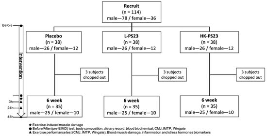 The study was conducted according to the guidelines of the Declaration of Helsinki. Experiments were performed after approval by the Institutional Review Board of Landseed International Hospital (Taoyuan, Taiwan; LSHIRB No. 22-003-A2) had been received. This trial was registered at clinicaltrials.gov (accessed on 6 October 2022) as NCT05346432. Males and females aged 20–40 years old were included in the study. Anyone with at least one of the following characteristics was excluded: (1) a history of cardiovascular disease, hypertension, metabolic disease, asthma, or cancer; (2) BMI ≥ 27; (3) 6 months with limb, neuromuscular motor impairment, etc., meaning the subject cannot engage in exercise; (4) having taken anti-inflammatory, analgesic, acute and chronic disease drugs or other drugs in the last month; (5) students or stakeholders of the principal investigator; (6) those who smoke or drink; (7) having used probiotic powder, capsules or lozenges (including yogurt, and other related foods) within two weeks; (8) food or lactic acid bacteria product allergy; (9) having undergone hepatobiliary gastrointestinal surgery (except hernia and polypectomy); (10) no specific sport or training activity in the past 1 year, such as basketball, volleyball, etc., involving multiple jumps or leg weight training. A total of 114 subjects from the National Taiwan Sport University were included in the trial, including 78 males and 36 females. All subjects were randomly assigned to 3 groups with an equal ratio of males and females in each group (26 males and 12 females/group). All participants signed a written informed consent form before starting the experiment. During the experiment, a small number of subjects in each group withdrew from the experiment due to changes in their physiological conditions, such as being diagnosed with COVID 19 or being temporarily unable to cooperate with the experimental schedule. The experimental procedure is described in Figure 1.