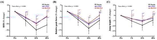 At 3, 24, and 48 h post-EIMD, the percentage changes in RFD and relative force peak were significantly lower in the placebo, L-PS23, and HK-PS23 groups compared with pre-EIMD (p < 0.05). However, from the between-group comparisons, the L-PS23 and HK-PS23 supplementation groups showed significantly less RFD loss and faster recovery than the placebo group at 24 and 48 h after EIMD (p < 0.0001) (Figure 2A). As shown in Figure 2B, the L-PS23 and HK-PS23 supplementation groups showed significantly less relative force peak loss than the placebo group at 3 and 24 h post-EIMD (p < 0.05); however, only the HK-PS23 group showed significantly better recovery than the placebo group at 48 h post-EIMD (p = 0.0008). The jump heights in the L-PS23 and HK-PS23 supplementation groups showed significantly less loss than the placebo group at 24 h post-EIMD (p < 0.05), but only the HK-PS23 group showed significantly better recovery than the placebo group at 48 h post-EIMD (p = 0.0097) and showed no significant difference from pre-EIMD (Figure 2C). Significant time effects for RFD, relative peak force, and jump height were shown (p < 0.0001).