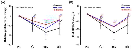 At 3, 24, and 48 h post-EIMD, the percentage changes in relative force peak and peak RFD were significantly lower in the placebo, L-PS23, and HK-PS23 groups compared with pre-EIMD (p < 0.0001). However, the L-PS23 group showed a significantly lower loss of relative force peak at 24 and 48 h post-EIMD, and the HK-PS23 group showed significantly less loss of relative force peak at 3, 24, and 48 h post-EIMD, compared with the placebo group (p < 0.05) (Figure 3A). On the other hand, the L-PS23 and HK-PS23 groups showed significantly less loss of peak RFD at 3 and 24 h post-EIMD and showed significantly better recovery at 48 h post-EIMD than the placebo group (p < 0.05) (Figure 3B). Significant time effects for relative peak force and peak RFD were shown (p < 0.0001).