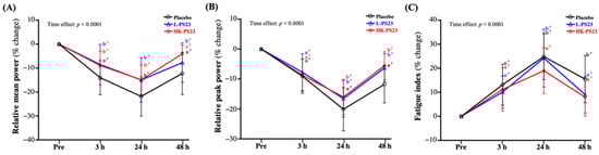At 3, 24, and 48 h post-EIMD, the percentage changes in relative mean power and relative peak power were significantly lower, and fatigue index was significantly greater in the placebo, L-PS23, and HK-PS23 groups compared with pre-EIMD (p < 0.0001). The L-PS23 and HK-PS23 groups showed significantly less loss of relative mean power compared to the placebo group at 3, 24, and 48 h post-EIMD (p < 0.05) (Figure 4A). As shown in Figure 4B, the L-PS23 and HK-PS23 groups showed significantly less loss of relative peak power than the placebo group at 24 and 48 h post-EIMD (p < 0.05). On the fatigue index, only the HK-PS23 group showed a significantly lower increase at 24 h post-EIMD than the placebo group (p < 0.05), but at 48 h post-EIMD, the L-PS23 and HK-PS23 groups showed a significantly smaller increase than the placebo group (p < 0.05) (Figure 4C). Significant time effects for relative mean power, relative peak power, and fatigue index wereshown (p < 0.0001).