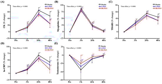 In the current study, all groups showed significantly increased CK, myoglobin, TBARS, and hs-CRP at 3, 24, and 48 h post-EIMD (p < 0.05). The increases in CK activity at 24 and 48 h post-EIMD were significantly reduced in the L-PS23 and HK-PS23 groups compared to the placebo group (p < 0.05) (Figure 5A). The myoglobin increase ratio in the L-PS23 and HK-PS23 groups at 3 and 48 h post-EIMD were significantly lower than those in the placebo group (p < 0.05) (Figure 5B). As shown in Figure 5C, the TBARS increase ratio in the L-PS23 and HK-PS23 groups at 24 and 48 h post-EIMD were significantly lower than those in the placebo group (p < 0.05), but at 3 h post-EIMD, HK-PS23 was also significantly lower than in the placebo and L-PS23 groups (p < 0.05). The hs-CRP increase ratios in the L-PS23 and HK-PS23 groups at 24 and 48 h post-EIMD were significantly lower than that in the placebo group (p < 0.05); in particular, at 48 h post-EIMD, the HK-PS23 group was significantly lower than the L-PS23 group (p < 0.0001) (Figure 5D). As shown in Figure 5E, at 3 and 24 h post-EIMD, the percentage changes in testosterone were significantly lower in the placebo, L-PS23, and HK-PS23 groups compared with pre-EIMD (p < 0.0001). However, at 48 h post-EIMD, only the placebo group still yielded lower results than pre-EIMD, and the L-PS23 and HK-PS23 groups showed no significant difference from pre-EIMD. In addition, the HK-PS23 group at 3 and 24 h post-EIMD yielded significantly higher values than the placebo group (p < 0.05), and also significantly greater than those of the L-PS23 group at 24 h post-EIMD (p < 0.05).