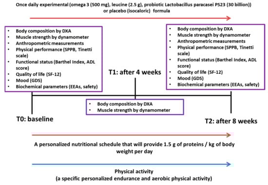 The primary aim of this randomized clinical trial was to evaluate the effectiveness of a special medical food composed of omega-3 fatty acids, leucine, and the probiotic LPPS23, compared to placebo, on appendicular lean mass (ALM) in sarcopenic patients using dual-energy X-ray absorptiometry (DXA). A secondary aim was to evaluate the effectiveness of this treatment on: (a) physical performance using the short physical performance battery (SPPB), (b) walking and risk of fall using the Tinetti scale, (c) force of hand flexor muscles using the handgrip, (d) changes in body composition using DXA, (e) functional state using the activity daily living (ADL) scale and Barthel index, (f) quality of life using the 12-item Short-form Health Survey (SF-12), (g) mood using the geriatric depression scale, (h) level of inflammation by measuring the C-reactive protein (CRP), fasting blood glucose (FBG), liver and kidney function, and (i) the plasma amino acid profile.