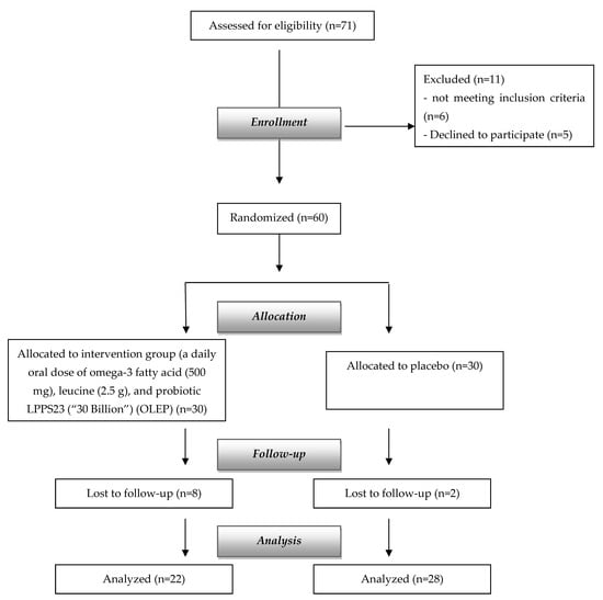 Subjects were randomly allocated to receive once daily the experimental formula: omega-3 fatty acid (500 mg, consisting n 64.71% EPA, 29.41% DHA and the remaining 5.88% omega-3 in general), leucine (2.5 g), probiotic LPPS23 (“30 Billion”, freeze dried) (OLEP), or the control formula: isocaloric placebo with the same flavor (Figure 1). The experimental and the control formulas were delivered as indistinguishable water-dispersible powder.