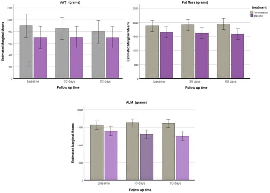 Body composition represented by fat-free mass (FFM) and FM were measured using a Lunar Prodigy DXA (GE Medical Systems, WI, USA). The in vivo coefficients of variation were 0.89% for the whole FM and 0.48% for FFM. Visceral adipose tissue (VAT) volume was estimated using a constant correction factor of 0.94 g/cm3. This software automatically places a quadrilateral box that represents the android region outlined by the iliac crest, with a superior height of 20% of the distance from the top of the iliac crest to the base of the skull []. The calculation of ALM was based on the sum of the fat-free mass from arms and legs. ALM was standardized by BMI according to previous studies [,] in order to normalize the data by height and weight. Measurements were performed at baseline (t0), after 30 days (t1) and after 60 days (t2).