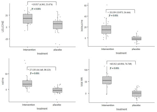 Figure 4 depicts the amino acids profile mean difference changes from baseline to 60 days. Amino acids profile represented by valine, leucine, isoleucine, and total amino acids showed a statistically significant increase in the intervention group in comparison to the placebo group at 60 days (p = 0.001).
