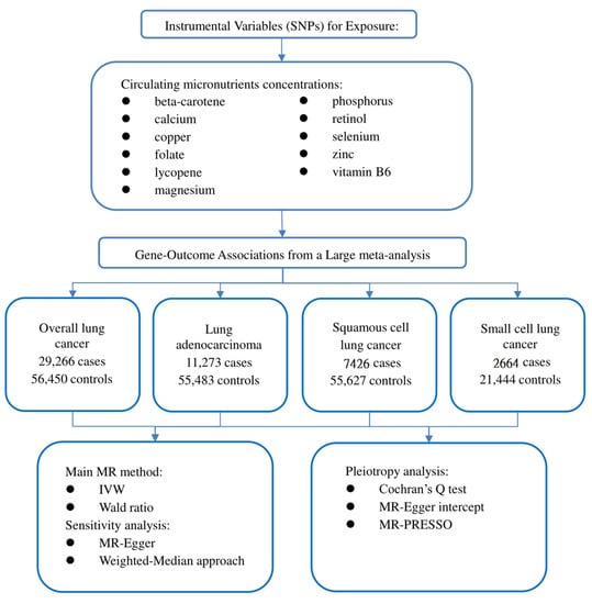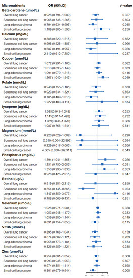 The following supporting information can be downloaded at: https://www.mdpi.com/article/10.3390/nu14214569/s1, Figure S1: Forest plots showing MR analyses by each SNP separately and the pooled MR result for beta-carotene and lung cancer risk; Figure S2: Forest plots showing MR analyses by each SNP separately and the pooled MR result for calcium and lung cancer risk; Figure S3: Forest plots showing MR analyses by each SNP separately and the pooled MR result for copper and lung cancer risk; Figure S4: Forest plots showing MR analyses by each SNP separately and the pooled MR result for folate and lung cancer risk; Figure S5: Forest plots showing MR analyses by each SNP separately and the pooled MR result for magnesium and lung cancer risk; Figure S6: Forest plots showing MR analyses by each SNP separately and the pooled MR result for phosphorus and lung cancer risk; Figure S7: Forest plots showing MR analyses by each SNP separately and the pooled MR result for retinol and lung cancer risk; Figure S8: Forest plots showing MR analyses by each SNP separately and the pooled MR result for selenium and lung cancer risk; Figure S9: Forest plots showing MR analyses by each SNP separately and the pooled MR result for zinc and lung cancer risk; Figure S10: Forest plots showing MR analyses by each SNP separately and the pooled MR result for vitamin B6 and lung cancer risk; Table S1: Summary information for 39 SNPs that were used as genetic instruments for Mendelian randomization analyses of 11 nutrient concentrations; Table S2: Summary information for 39 SNPs that were used as genetic instruments for Mendelian randomization analyses of 11 nutrient concentrations and risk of overall lung cancer; Table S3: Summary information for 39 SNPs that were used as genetic instruments for Mendelian randomization analyses of 11 nutrient concentrations and risk of Squamous cell lung cancer; Table S4: Summary information for 39 SNPs that were used as genetic instruments for Mendelian randomization analyses of 11 nutrient concentrations and risk of Lung adenocarcinoma; Table S5: Summary information for 39 SNPs that were used as genetic instruments for Mendelian randomization analyses of 11 nutrient concentrations and risk of Small cell lung cancer; Table S6: IVW method and sensitivity analyses using WMA1 and MR-Egger method1 for the Mendelian randomization analyses of 11 nutrient concentrations and risk of lung cancer; Table S7: Cochran’s Q test and MR-Egger intercept and MR-PRESSO Mendelian randomization analyses of 11 nutrient concentrations and risk of lung cancer; Table S8: Statistical power for the Mendelian randomization analyses of 11 nutrient concentrations and risk of lung cancer.