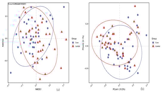 The beta diversity of PIH and healthy controls. (a) NMDS analysis in two groups. (b) PCoA analysis in two groups.